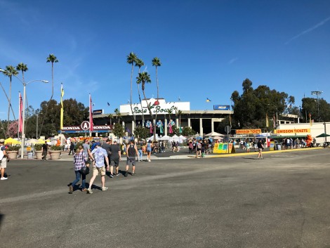 Keep looking and you will find a free parking spot on one of the grassy lots edging the Rose Bowl or on the street. A handicap parking lot is near the entrance (also free). VIP parking lots closest to entrance charge a fee. Bottlenecking happens, but compared to driving the freeways, parking is a piece of cake, easy as pie.