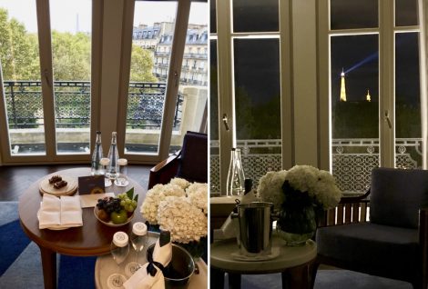The room, decorated in shades of white, dark blue, and grey, held a large bed, a marble topped desk and chair, plus two chairs placed around a coffee table filled with welcome gifts (white hydrangeas, Champagne, chocolate pastries, a bowl of fruit).