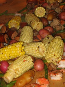 So let’s say in a fit of madness you invited the _________(fill in the blank: family, neighbors, office friends, beer-drinking pals) for an impromptu mid-summer dinner. You have less than two hours to shop, cook and otherwise get ready. Watta ya do? First head to a grocer that has it all: shrimp, plump smoked sausages, small flavorful potatoes, corn on the cob, fresh green beans, crab/shrimp boil seasoning (such as Old Bay and/or Zatarain’s), great crusty bakery bread, butter, an assortment of mustards, cocktail sauce, and a truly fine dessert—oh, yes, cold beer and a few cheery bottles of wine, butcher paper and plastic table cover (or you can use trash bags).