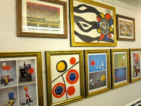 And stunning commissioned pieces, such as a white porcelain mural backing the reception desk, a wildly colorful glass and porcelain jungle scene framing the swimming pool, and a life-size glass horse sitting on the main landing, enrich public areas.